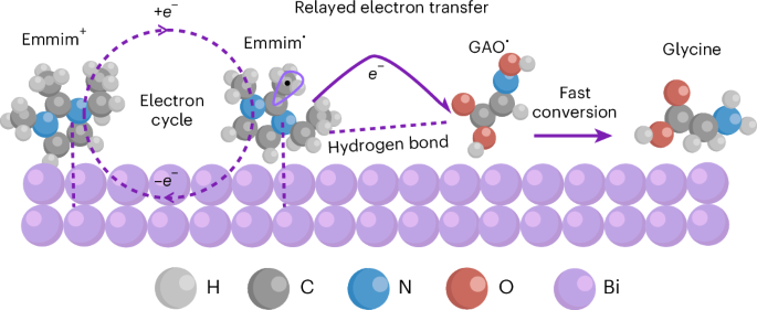 近期,该团队发现离子液体EmmimNO3锚定在金属Bi表面后,在电合成甘氨酸过程中Emmim+可以原位形成Emmim•自由基,可介导电子转移过程,并且首次提出了离子液体自由基介导的“接力电子转移”机制。在电解过程中,Bi表面的Emmim+被还原生成稳定的Emmim•自由基,这些自由基作为电子中介体,能够快速将电子传递给关键中间体乙醛酸肟,从而显著加速其转化为甘氨酸的反应动力学。通过离子液体自由基介导的“接力电子转移”,甘氨酸法拉第效率达到81.1%,电流密度高达286.2 mA cm-2。该研究不仅开发出一种用于电化学合成甘氨酸的高性能催化剂,还揭示了由离子液体自由基介导的新型电子转移机制,为加速催化过程中的电子转移提供了新策略,有望用于发展更多新反应路线。