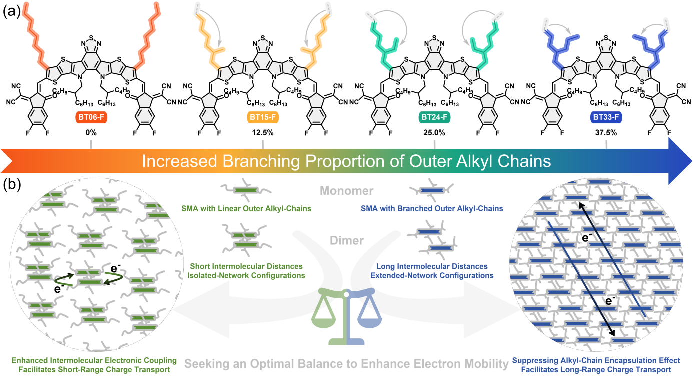 图1 (a) BT06-F、BT15-F、BT24-F和BT33-F的化学结构及相应的外烷基链的支化比例 (b) 面向提高电子迁移率的SMA外侧烷基链设计策略